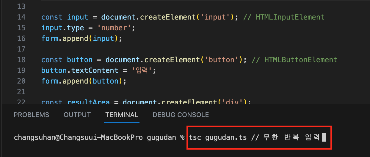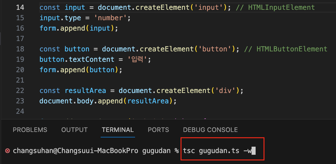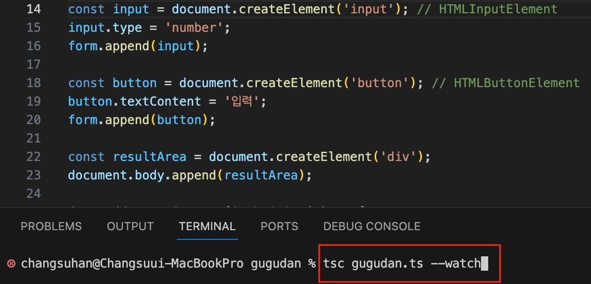 ※ 참고 : 터미널에서 'ctrl + c(맥북은 control + c)'를 입력하고 엔터를 치면, 실행 중인 'tsc [파일명] -w' 혹은 'tsc [파일명] --watch' 명령어가 중지됩니다.